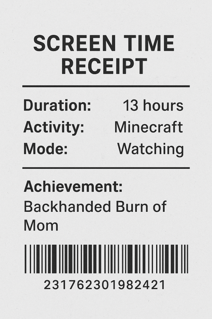Last night, T decided sleep is optional and self-control is overrated. Midnight hits, and instead of closing his eyes like a normal tween, he launches into a 13-hour YouTube binge. The content? Some guy… playing Minecraft. Not playing it himself. Watching someone else play it.